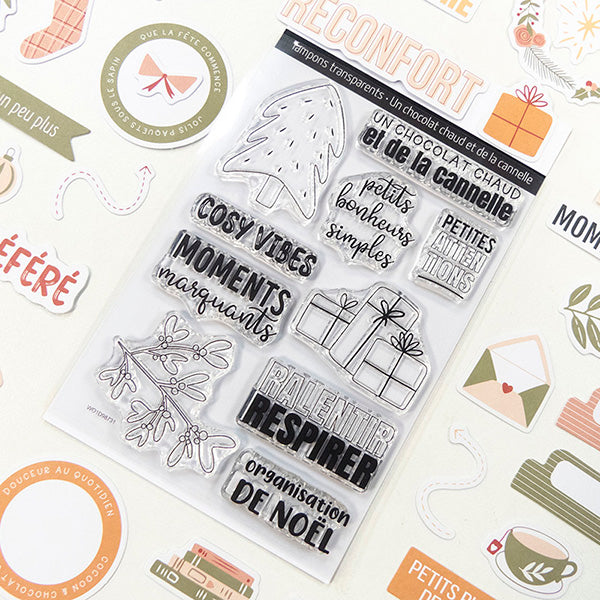 Une jolie planche de tampons sur le thème Des fêtes de Noël, associée à la collection Un chocolat chaud et de la cannelle.